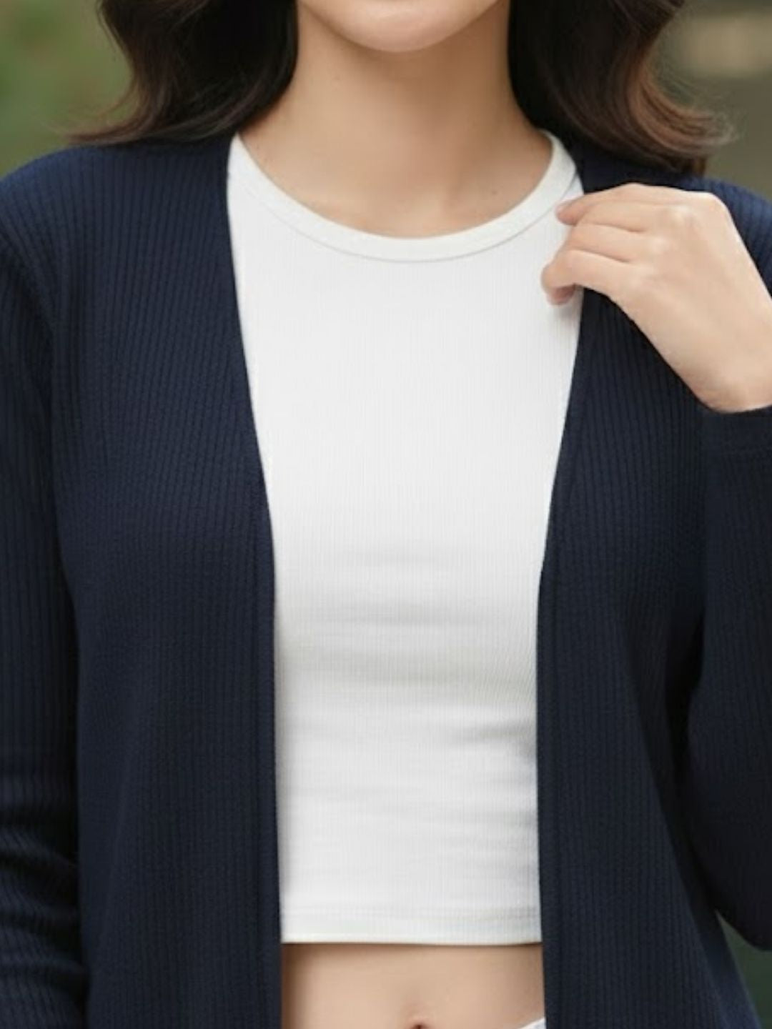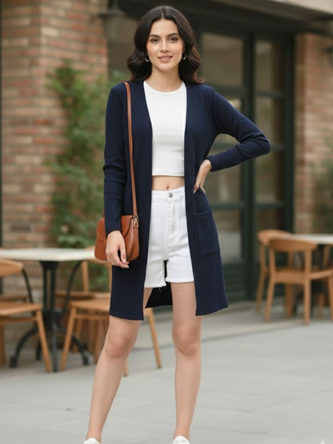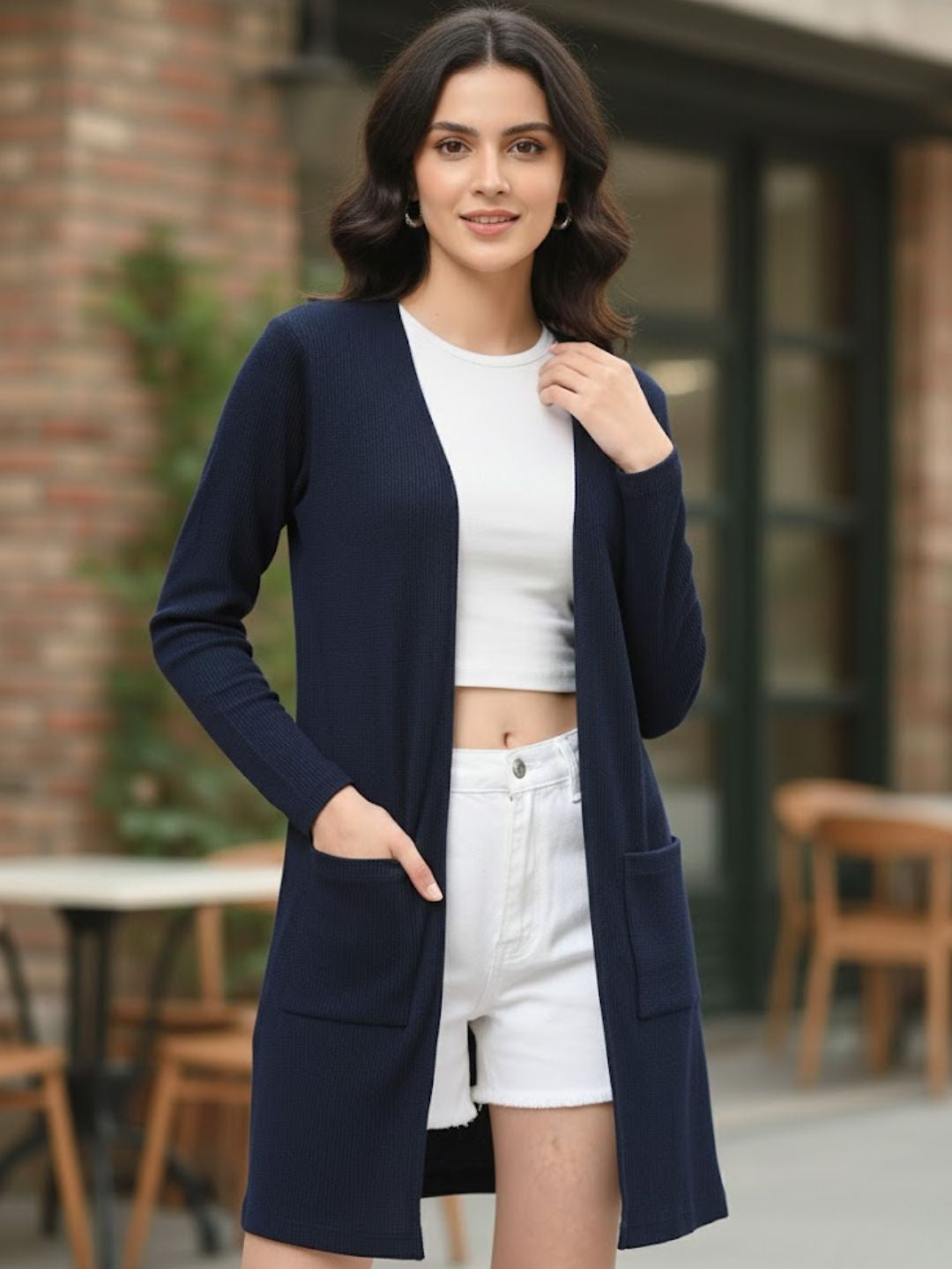 Navy Blue Waffle Knit Open Front Longline Shrug with Pocket