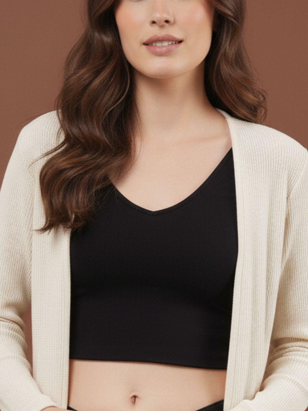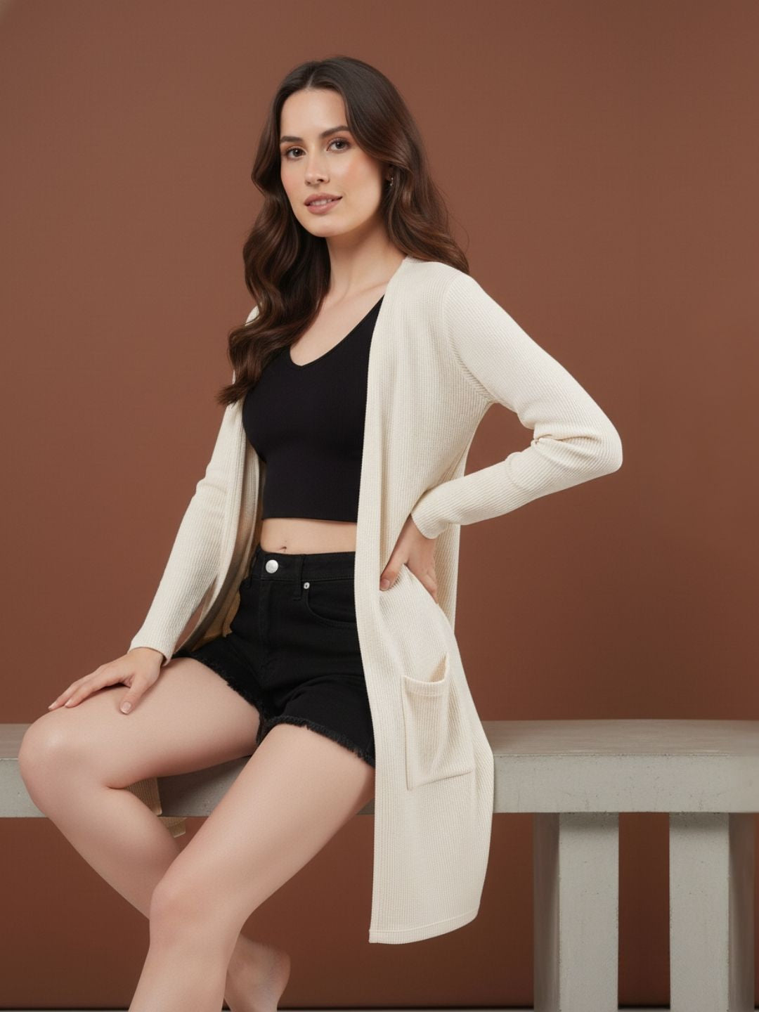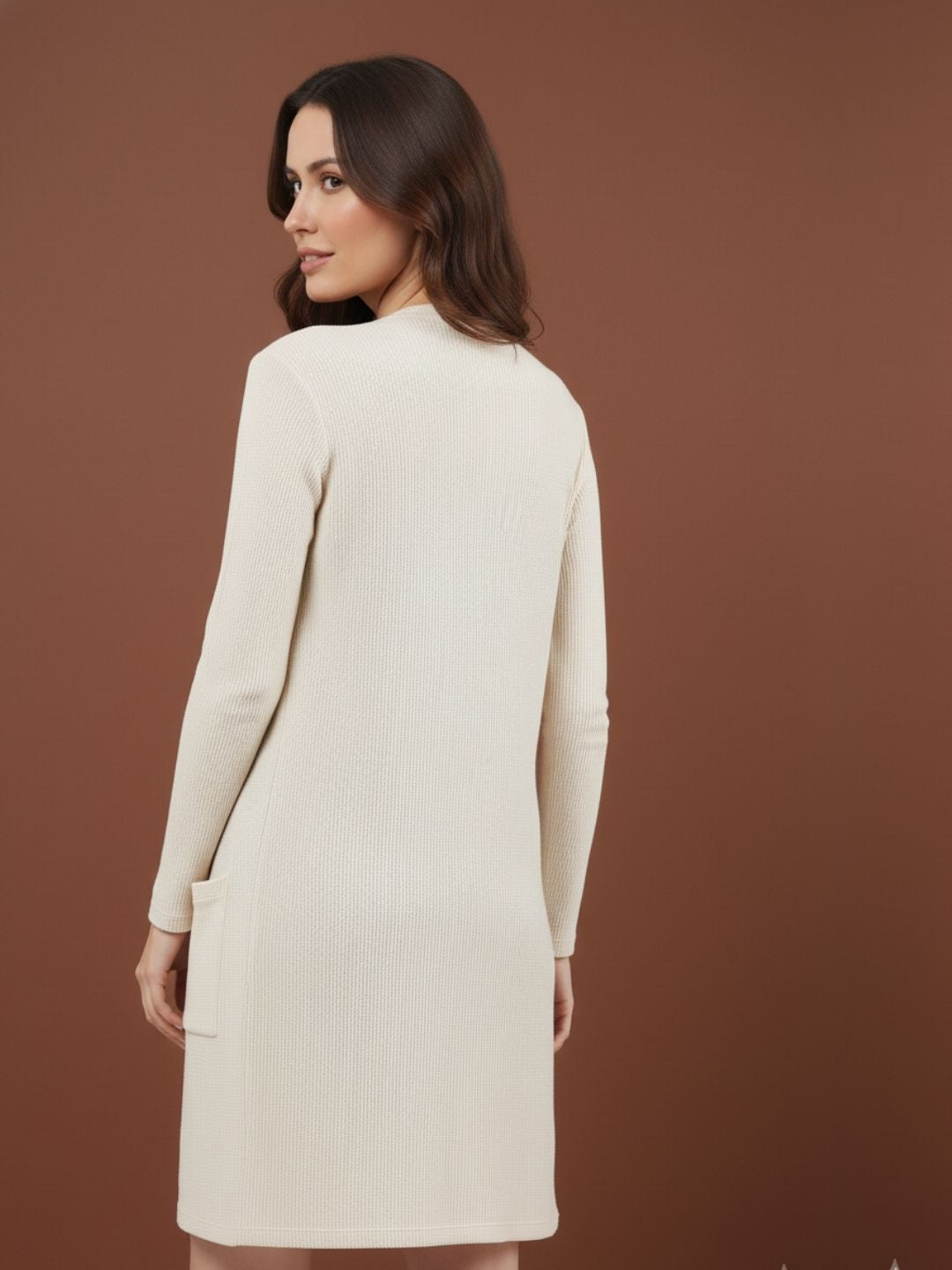 Off White Waffle Knit Open Front Longline Shrug with Pocket