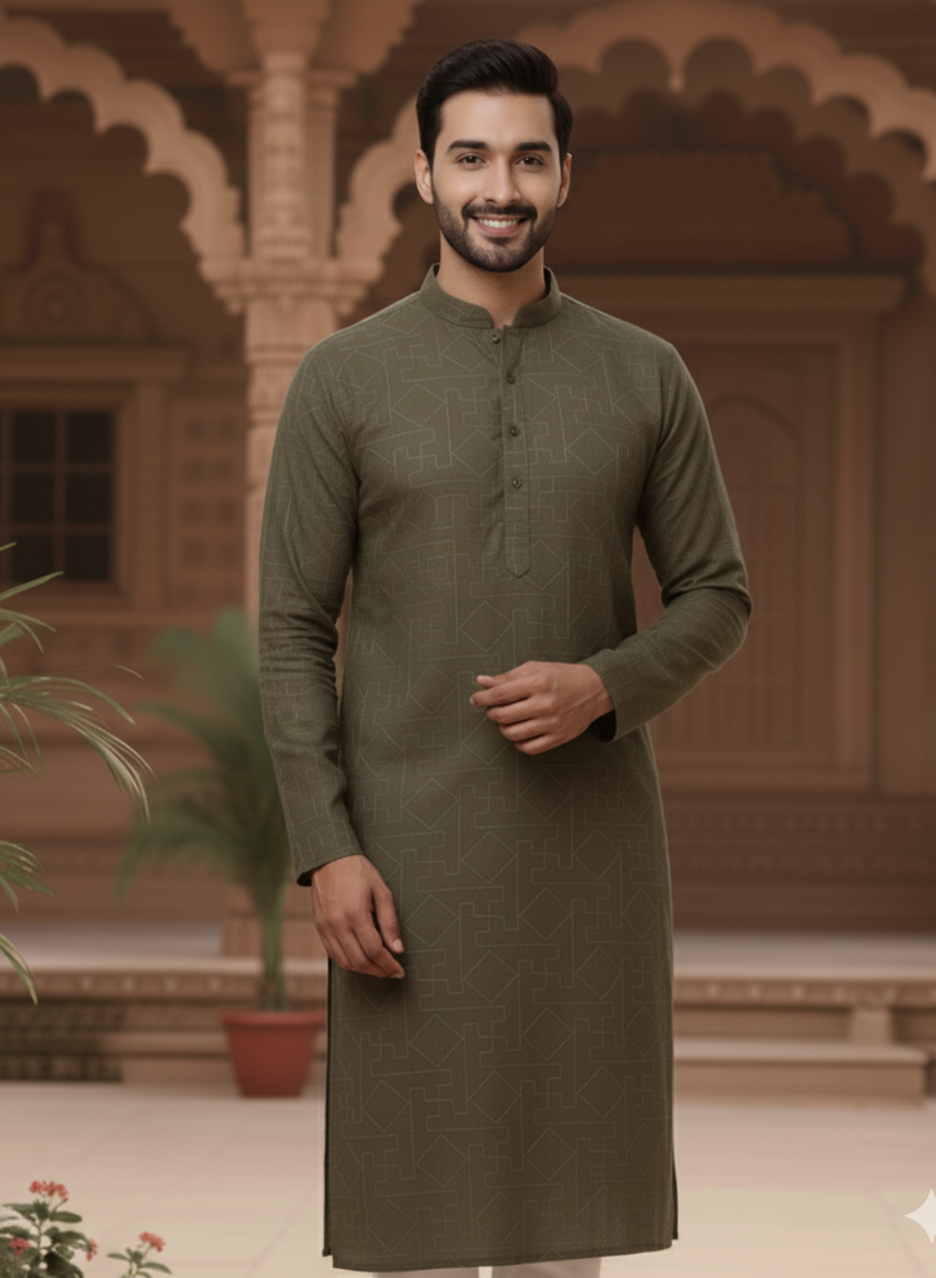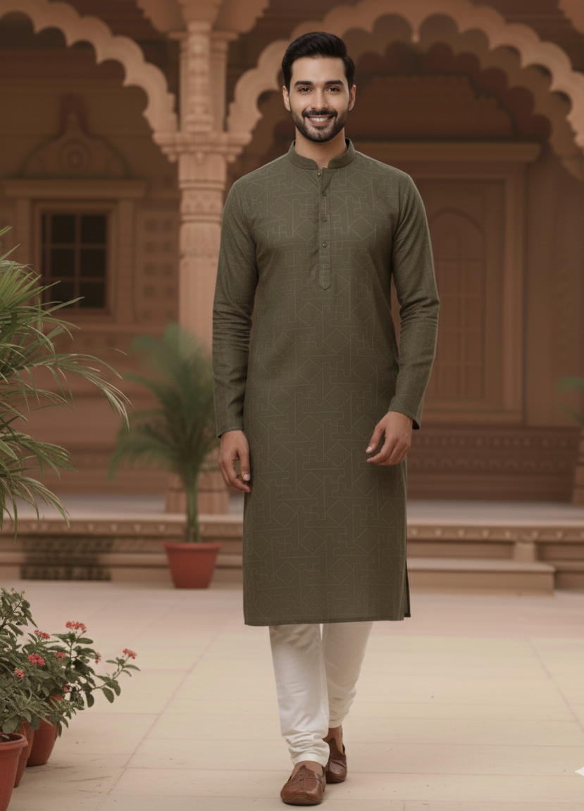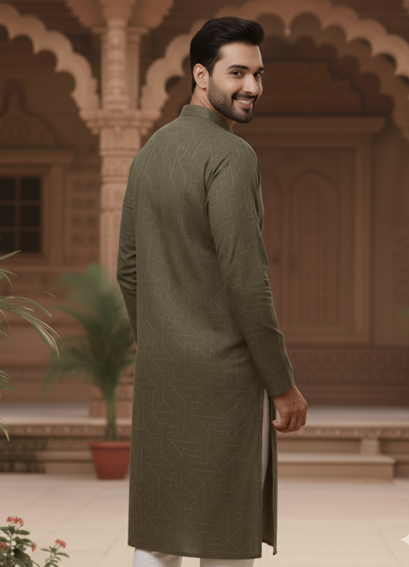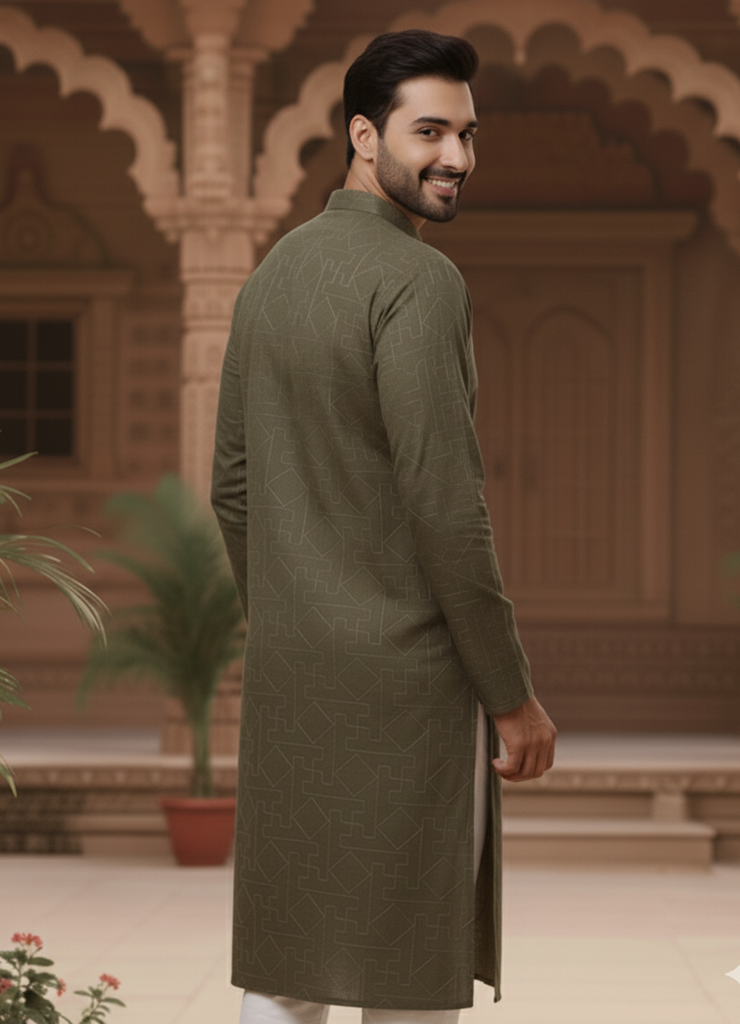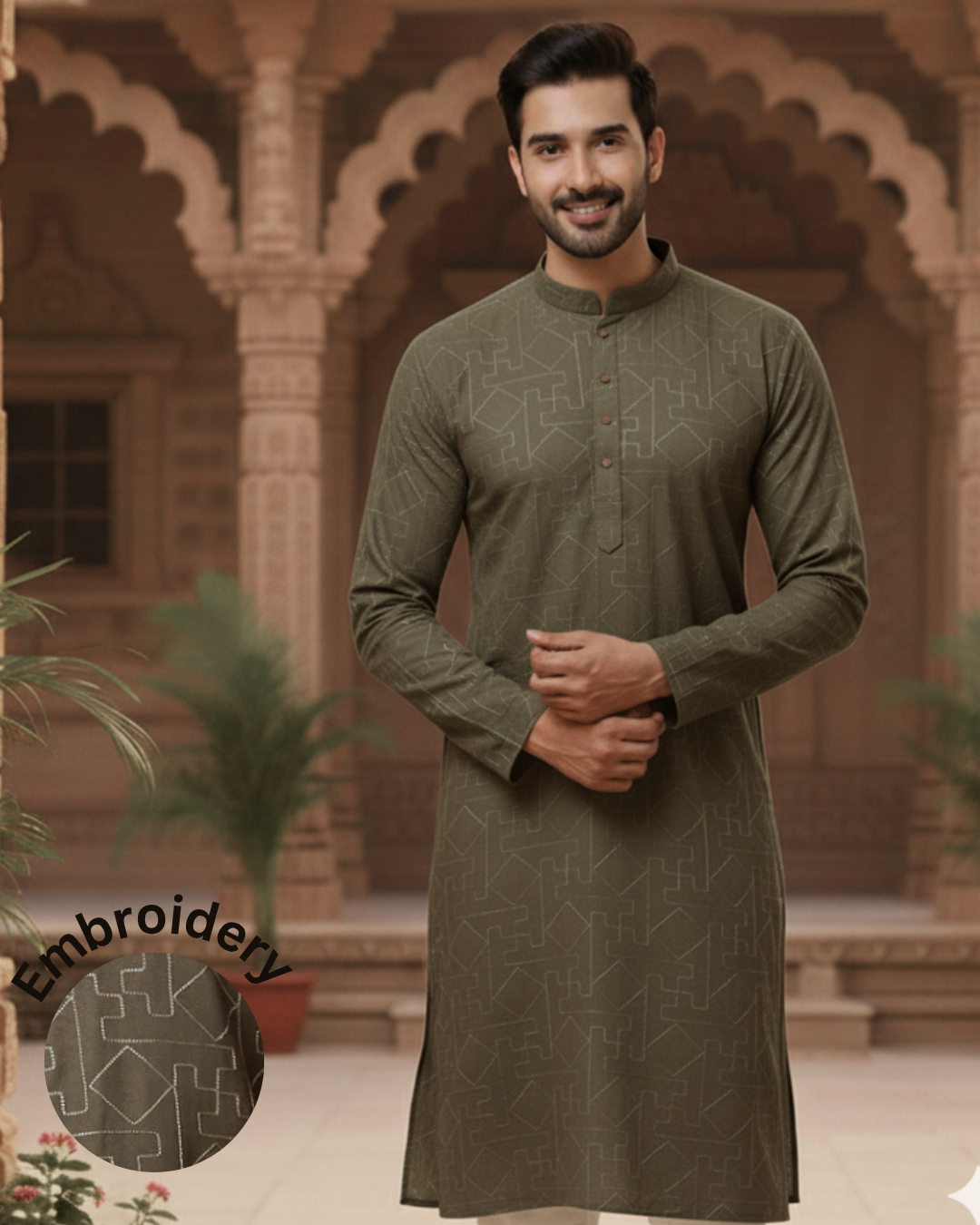 Olive Green Loose Fit Zig Zag Embroidered Kurta