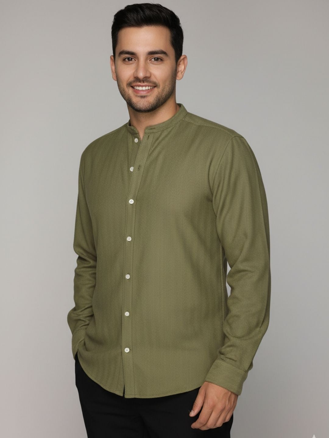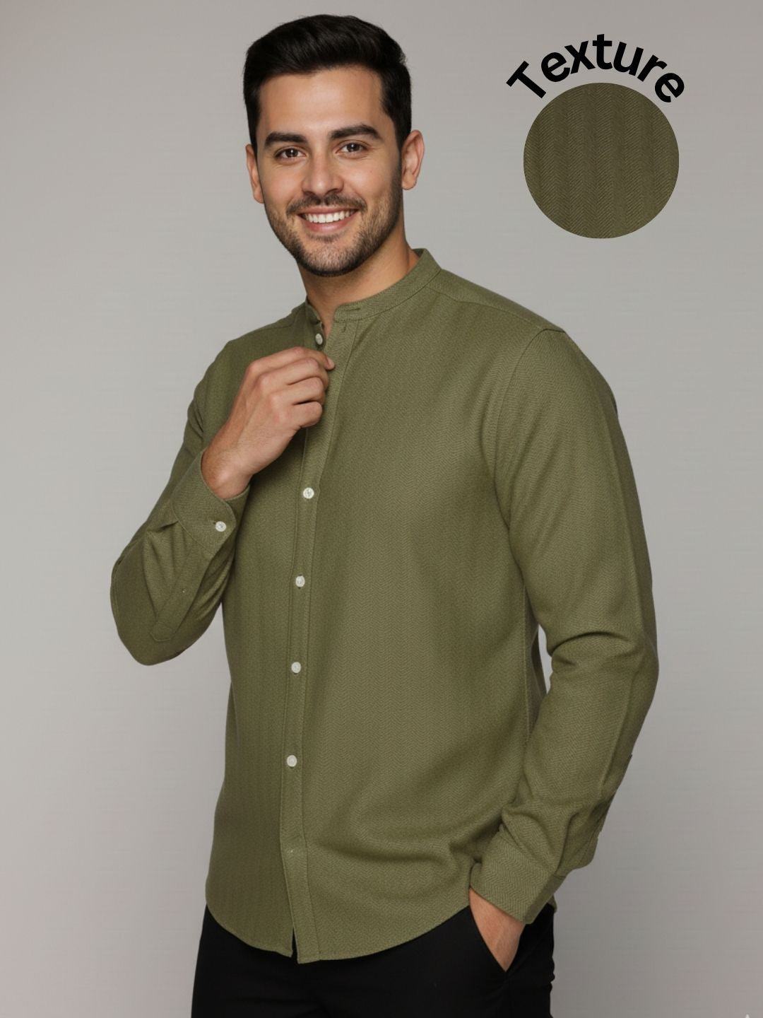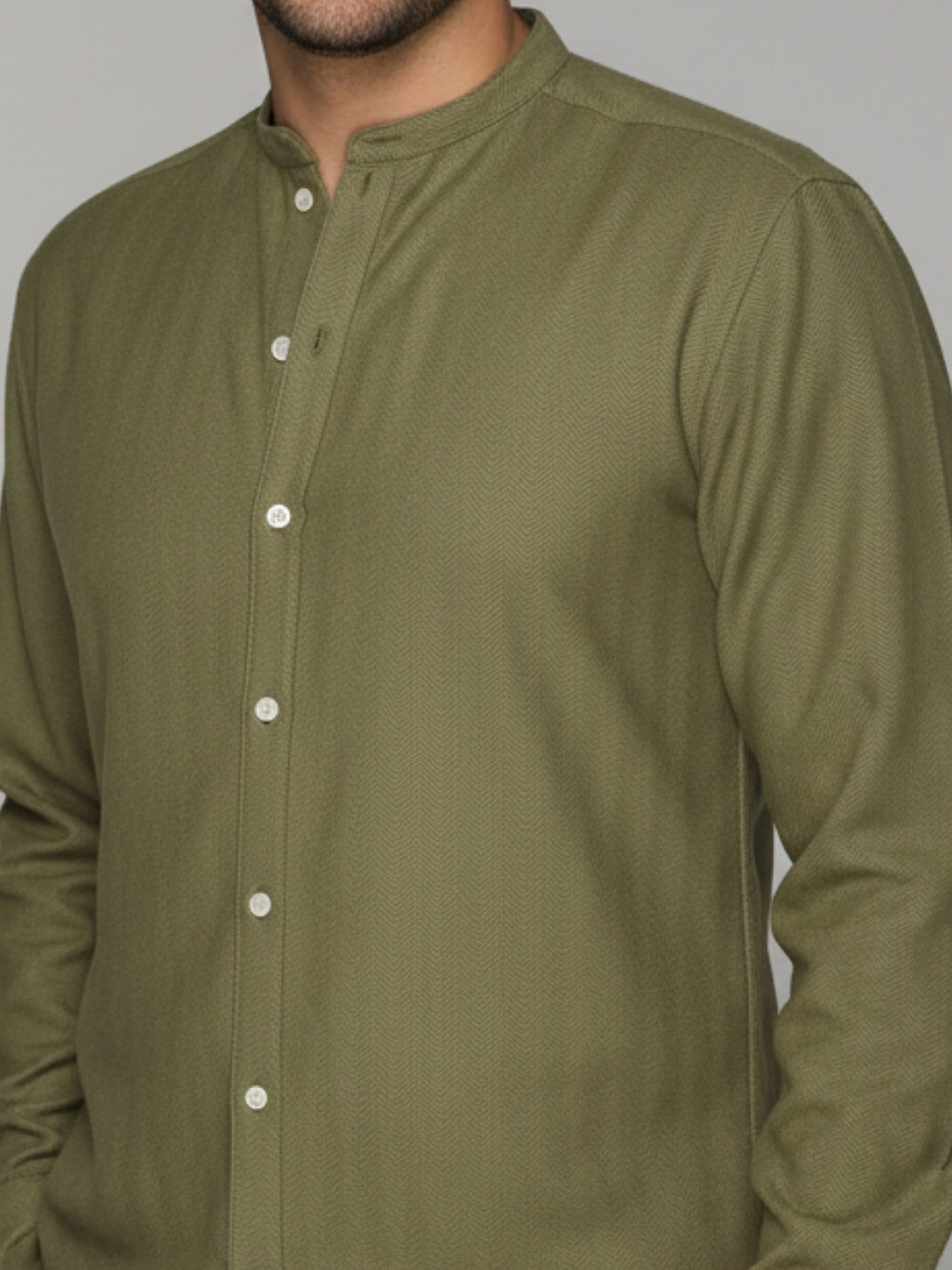 Olive Herringbone Mandarin Full Sleeve Shirt