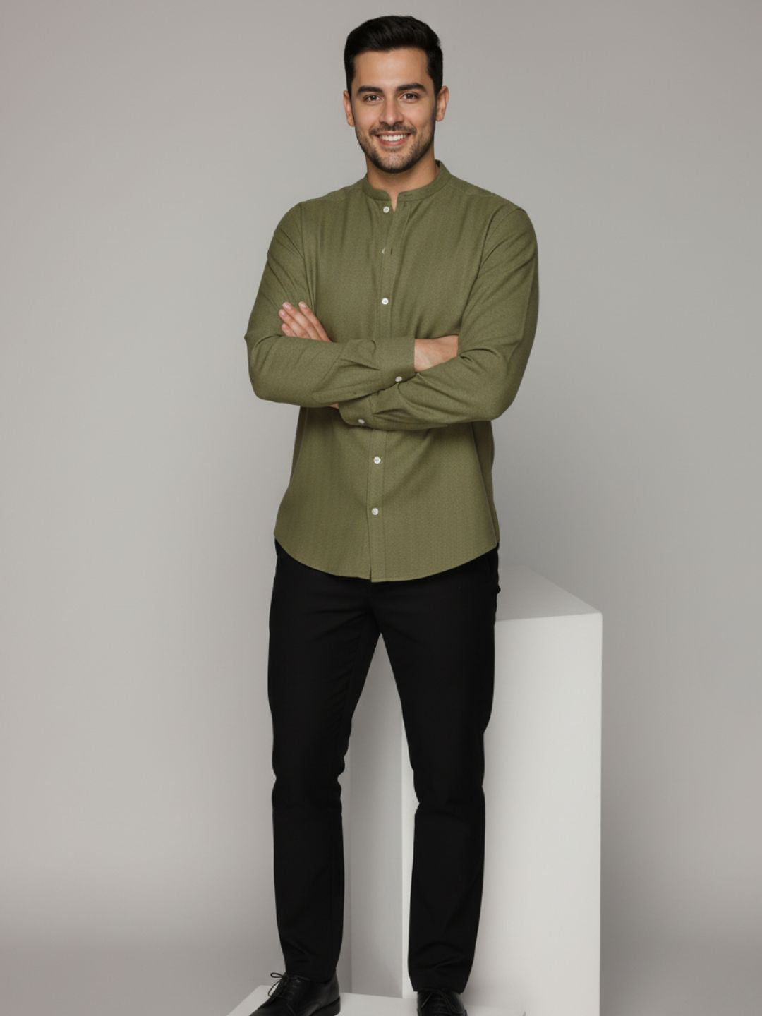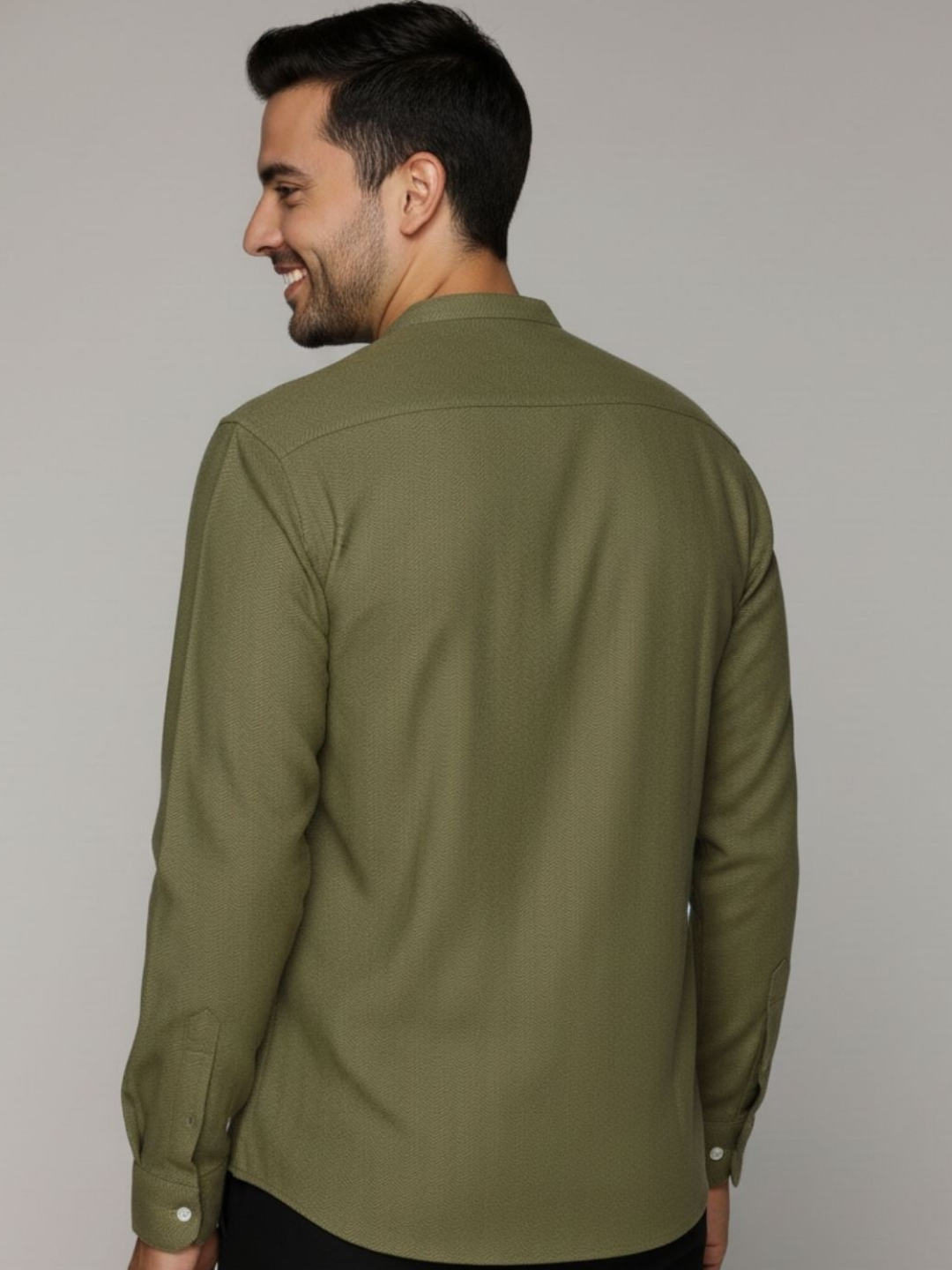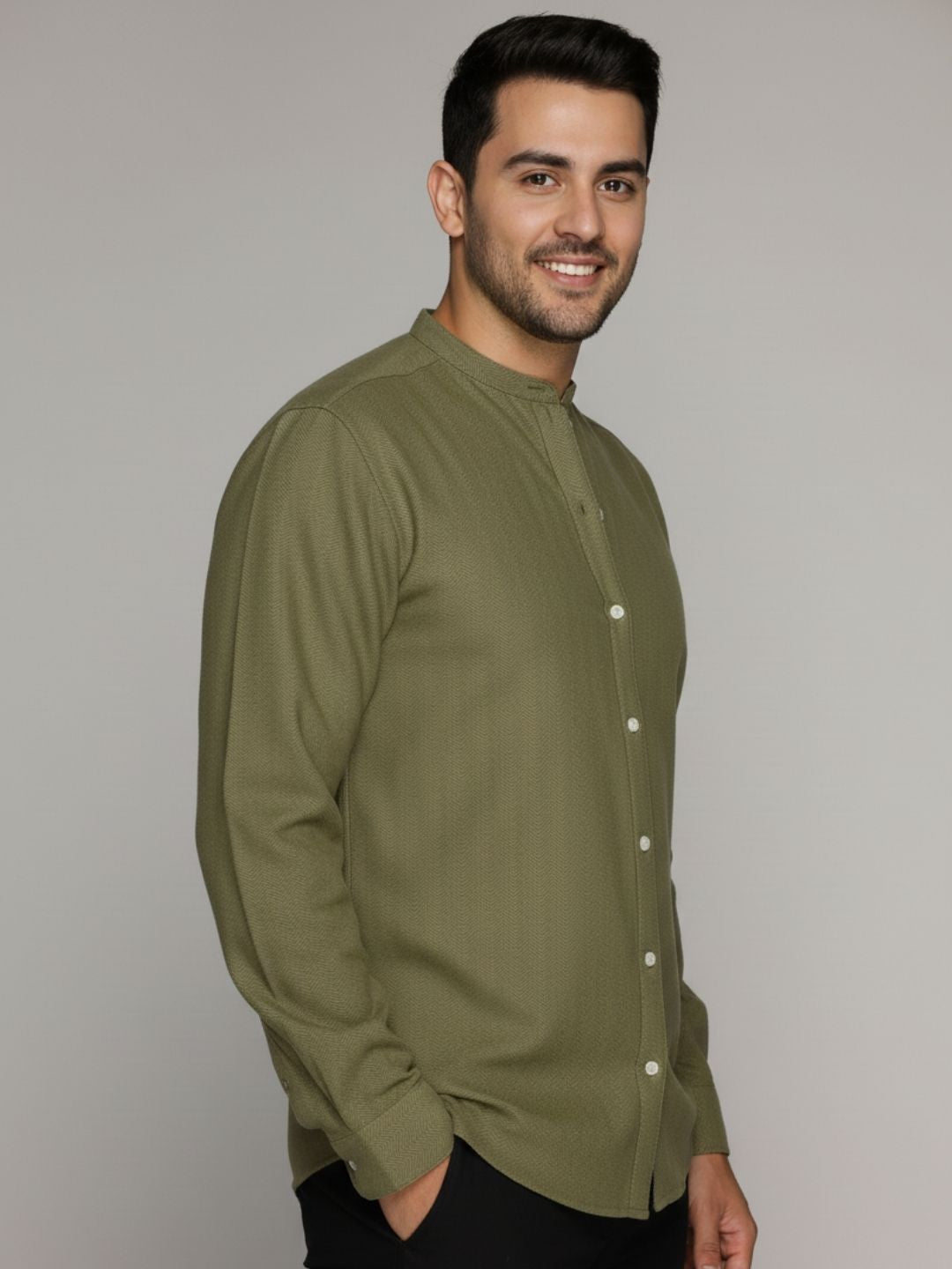Olive Herringbone Mandarin Full Sleeve Shirt