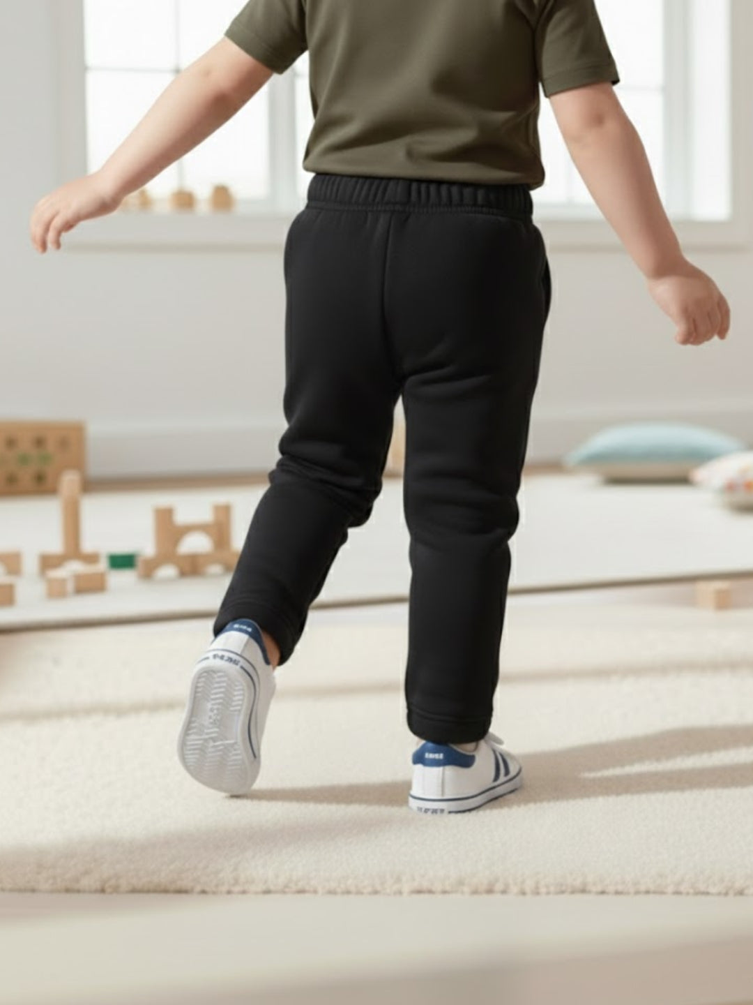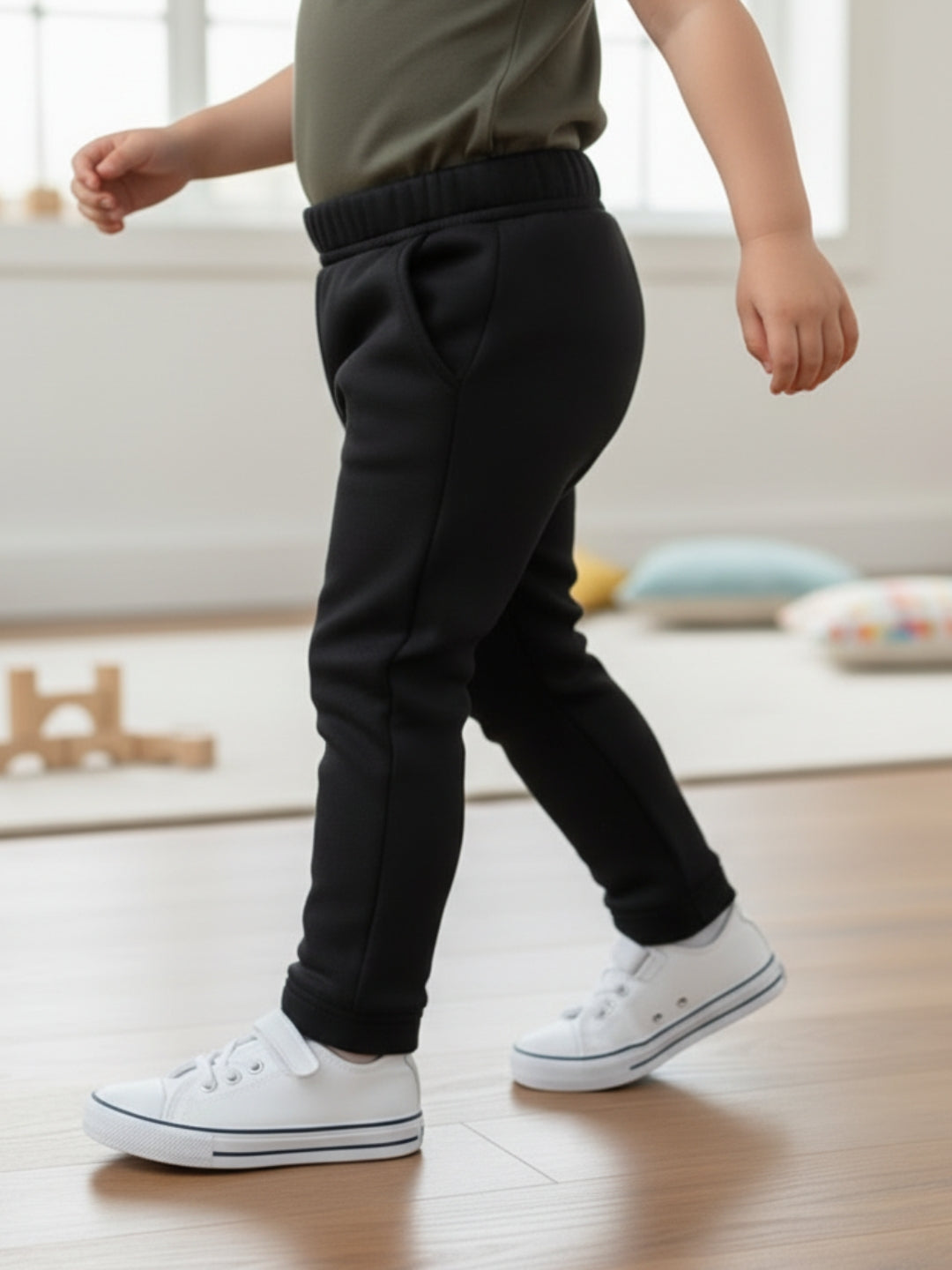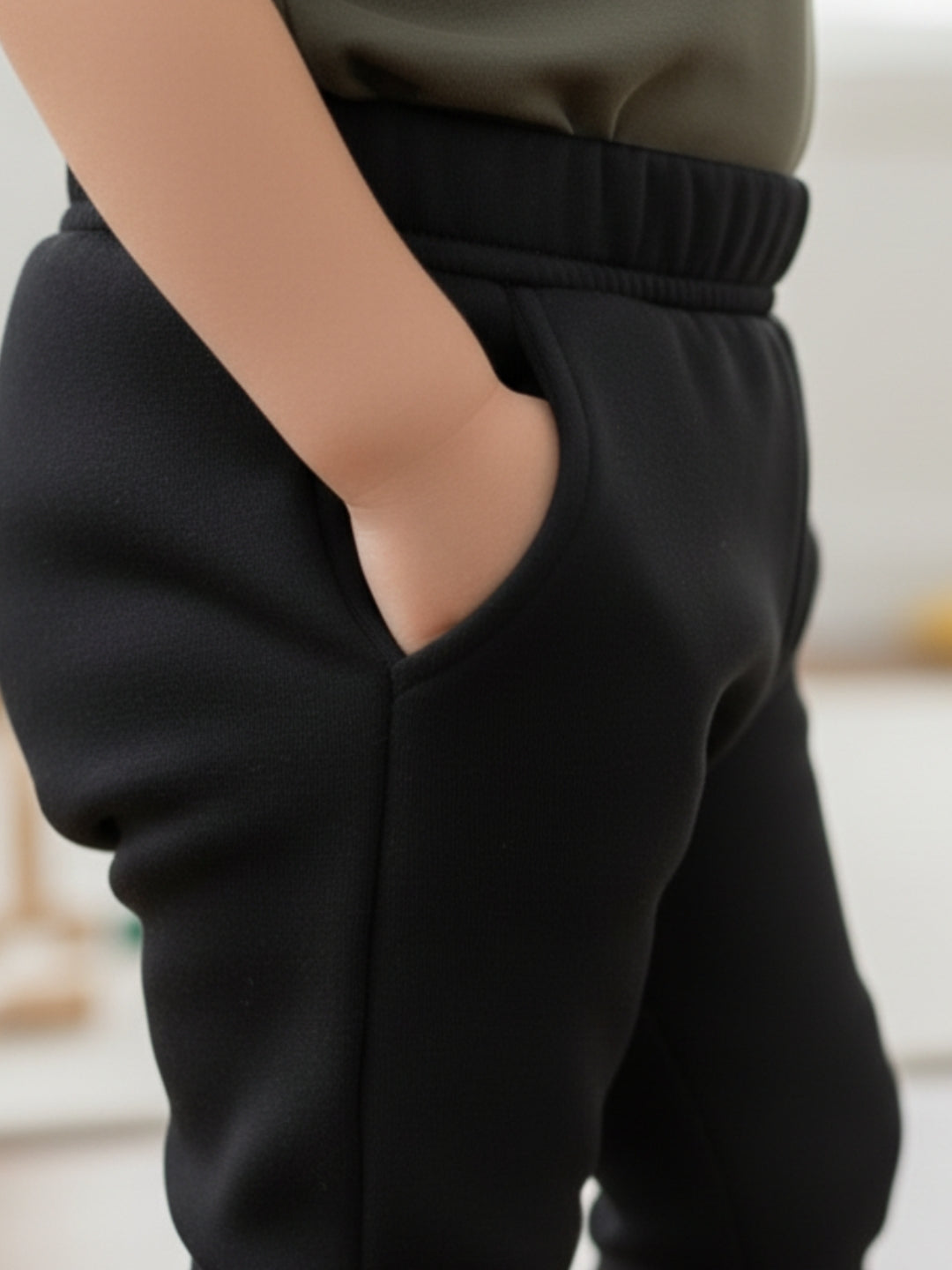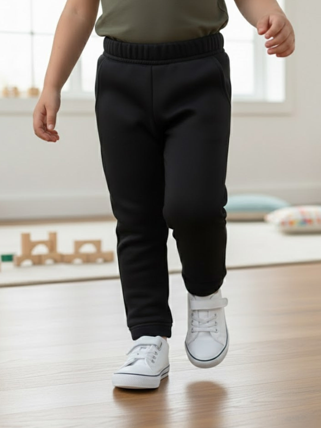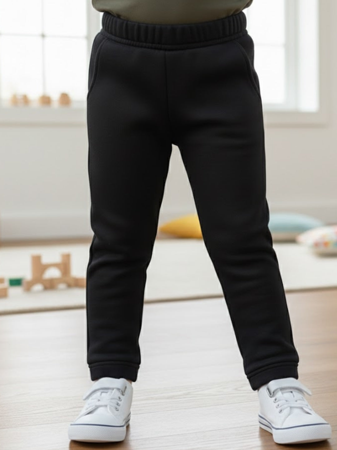 Black Solid Terry Pants| Soft Elastic Waist Full-Length Pants for Daily Wear