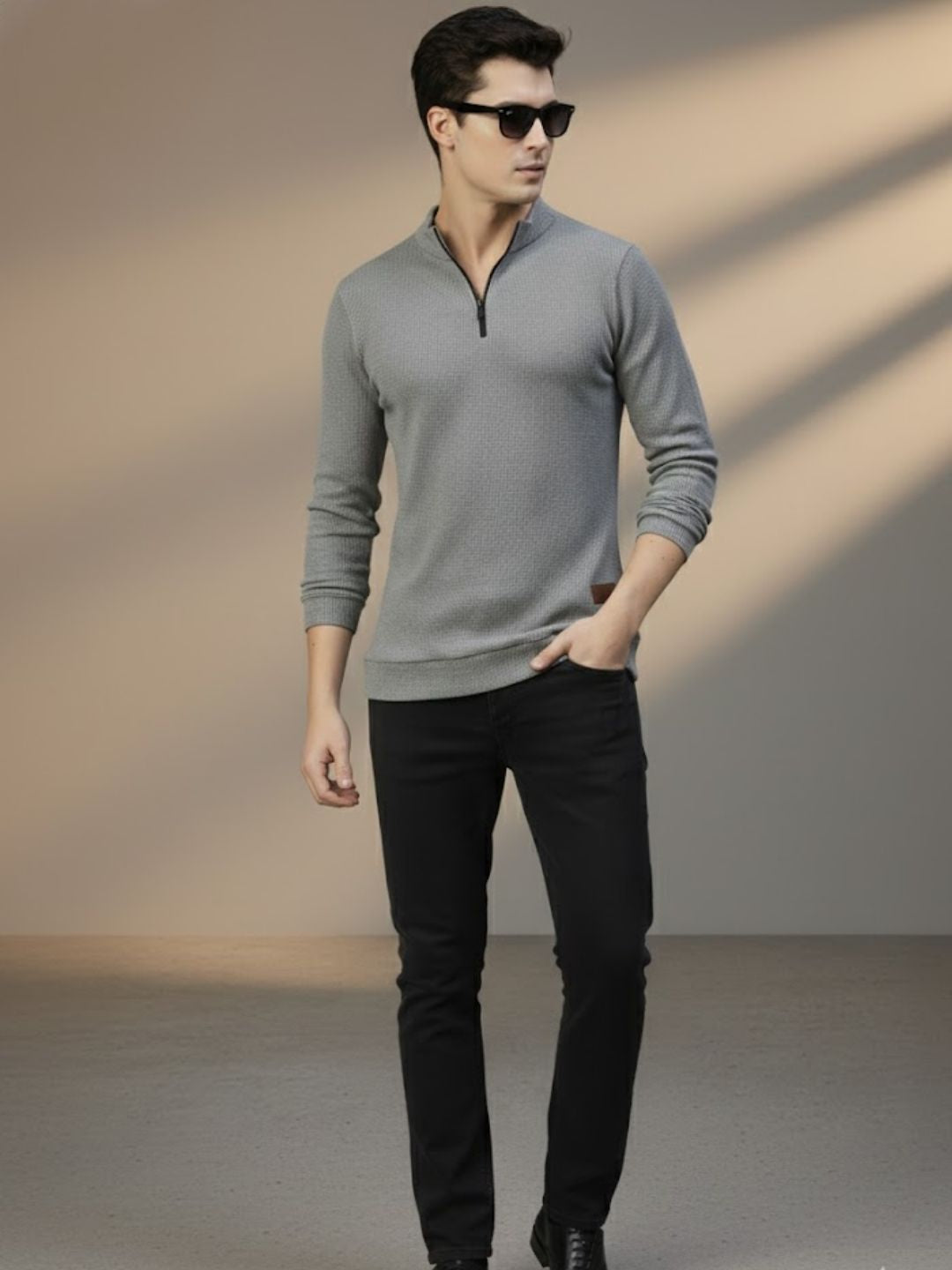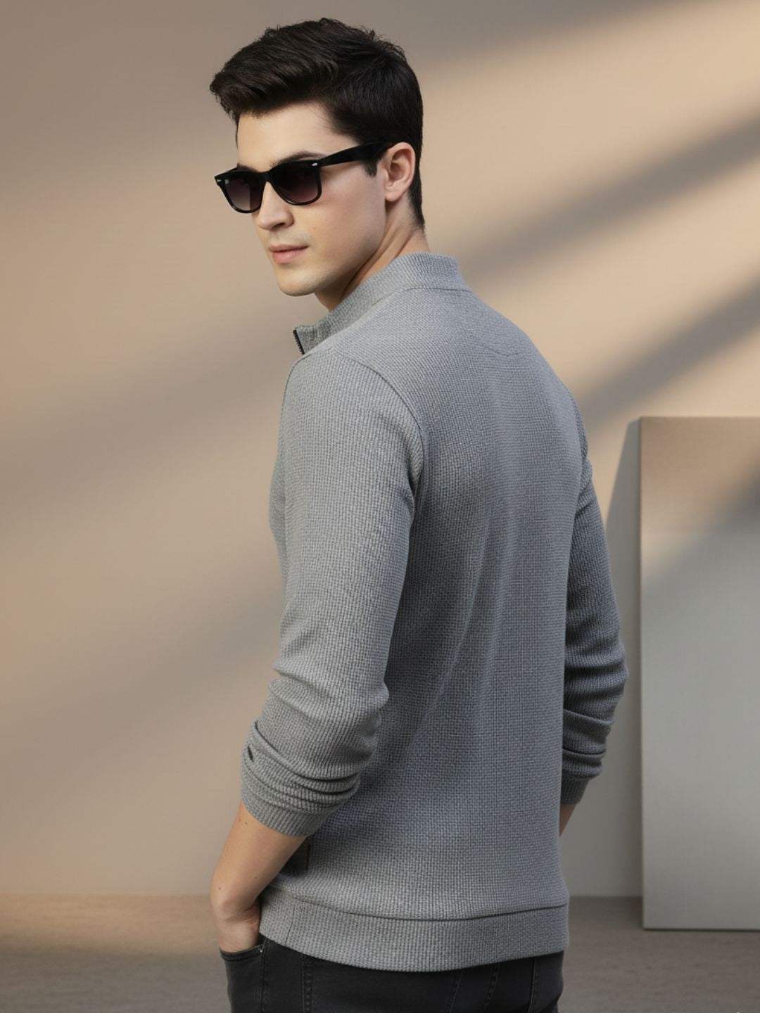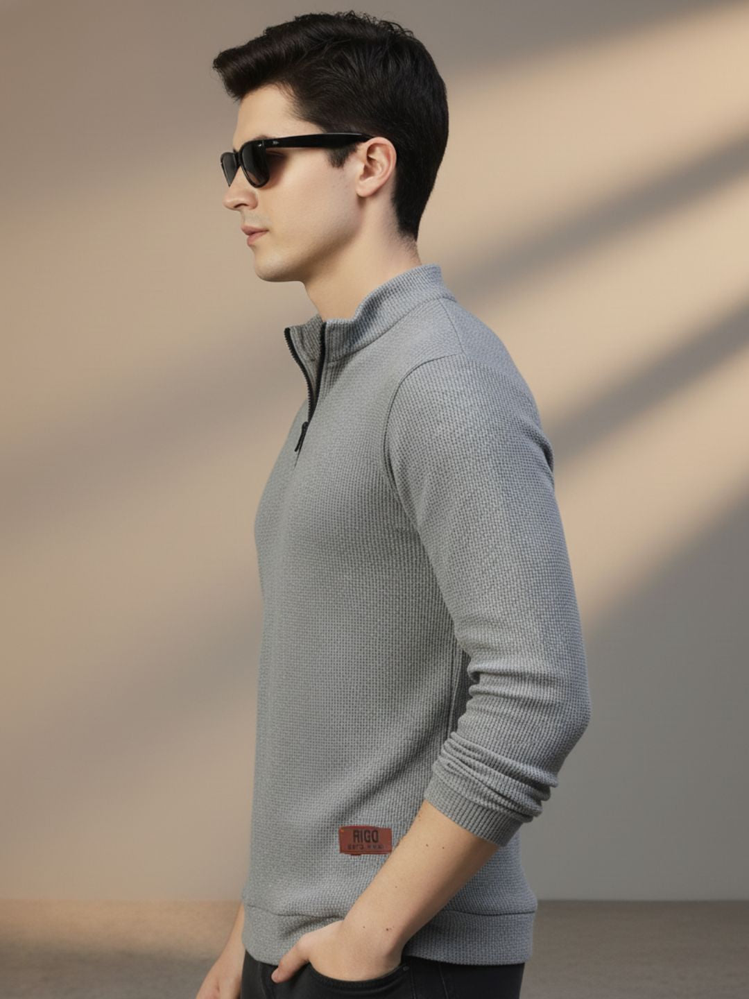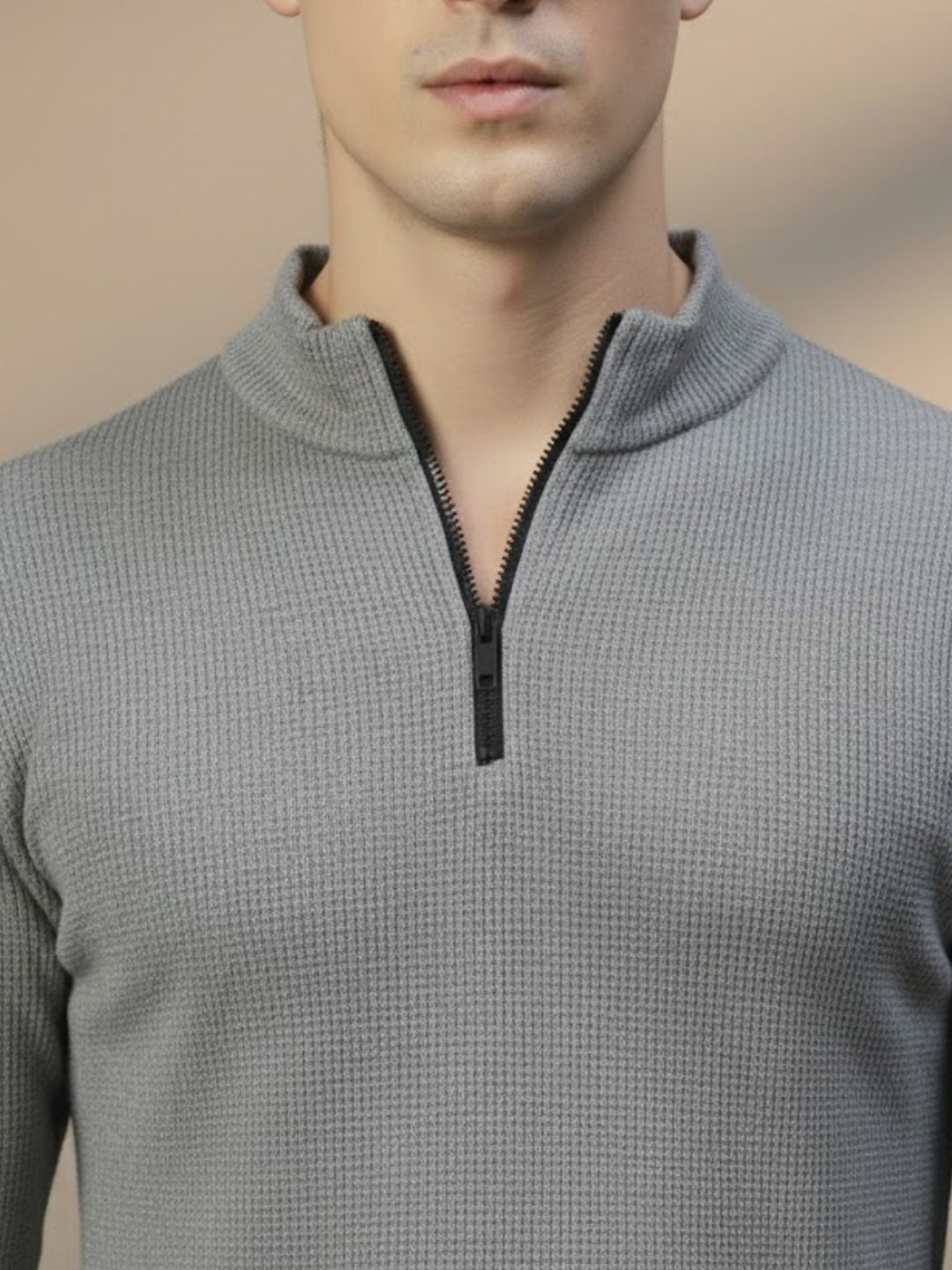 Grey Waffle Regular Fit Zip Up Polo T Shirt